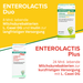 - Enterolactis Duo enthält die patentierten, lebenden Milchsäurebakterien Lacticaseibacillus casei DG. Dank einer speziellen Schutzhülle sind diese widerstandsfähig gegenüber Magen- und Gallensäure, wodurch sie den Darm lebend erreichen können. Die Formel wird durch 4 g Inulin pro Sachet ergänzt, einem löslichen Ballaststoff.